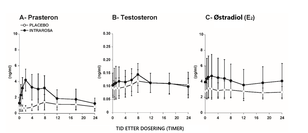 Serumkonsentrasjoner av DHEA (A), testosteron (B) og østradiol (C) målt over 24 timer på dag 7 efter daglig administrering av placebo eller Intrarosa (gjennomsnitt ± SD).